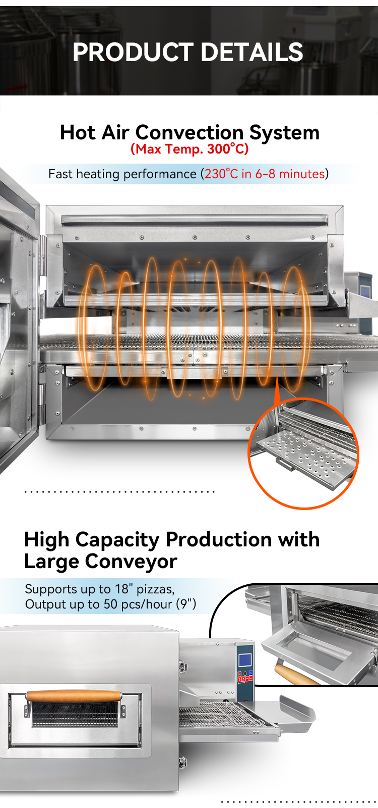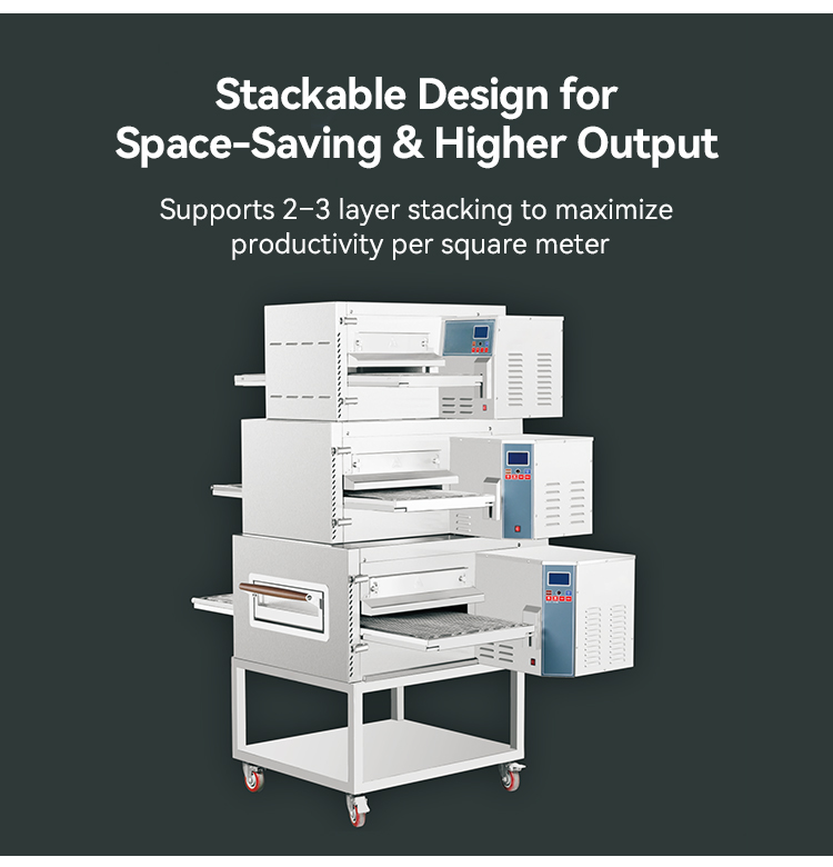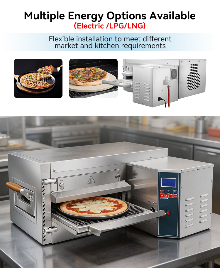 The conveyor pizza oven is fast, consistent, efficient, automated and space-saving, making it an ideal choice for catering establishments such as fast food restaurants, pizza chains and large restaurants.