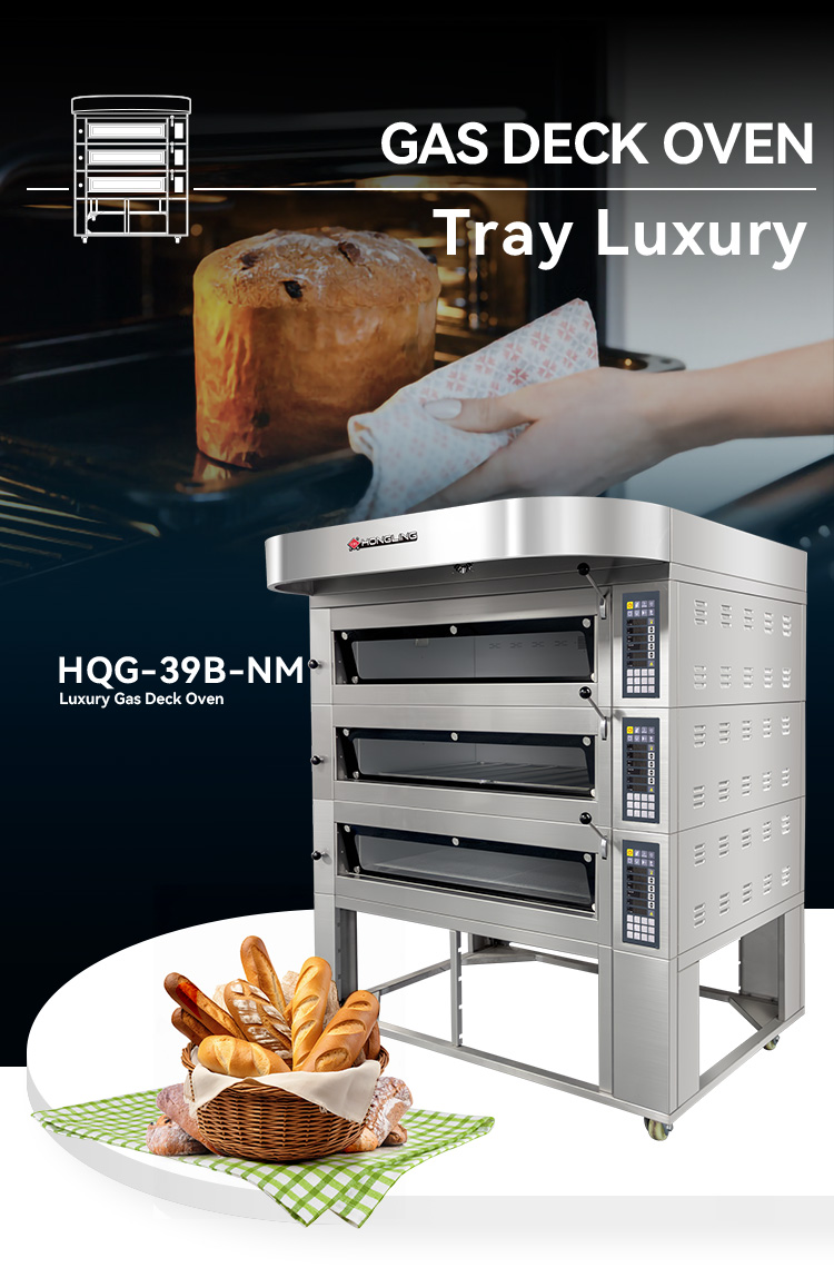 This gas oven features a stainless steel gas heater, 1.2t SS201 front panel, 2.0t bottom plate, touch screen controller, and advanced heating system for efficient and precise baking.